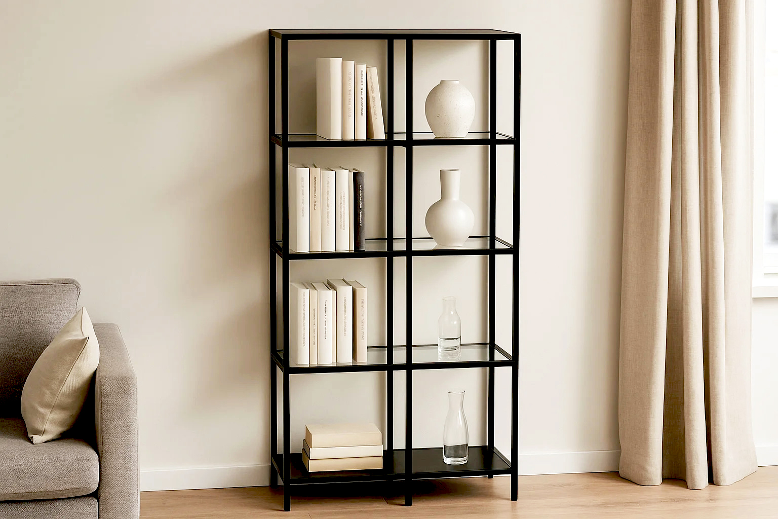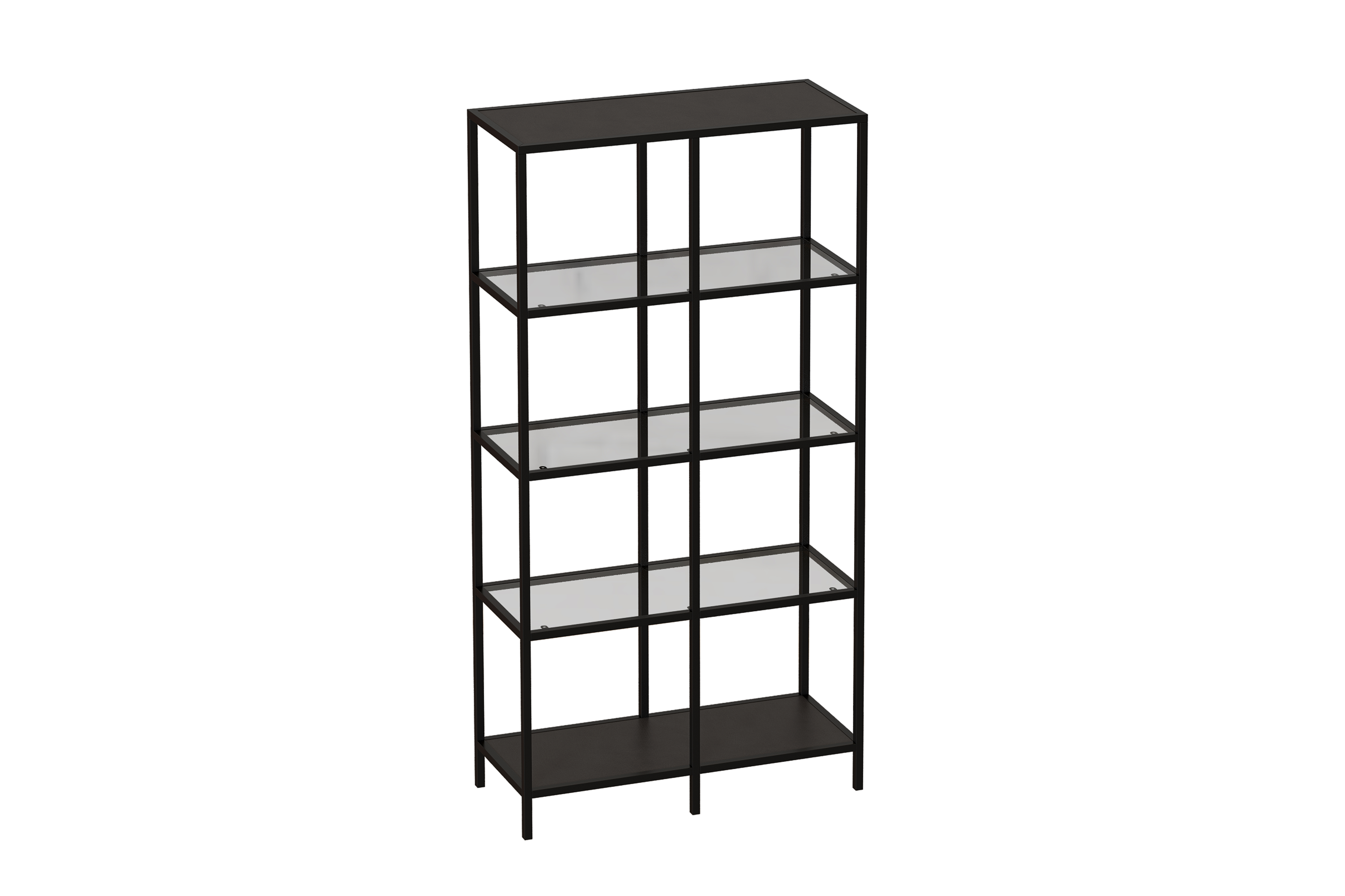 Стеллаж со стеклянными полками  "Нора". Опорой для стеллажа служит черный металлокаркас. Верхняя и нижние полки металлические. Средние выполнены из прозрачного стекла толщиной 5 мм. Опоры регулируются по высоте. Предусмотрены отверстия для фиксации к стене.
