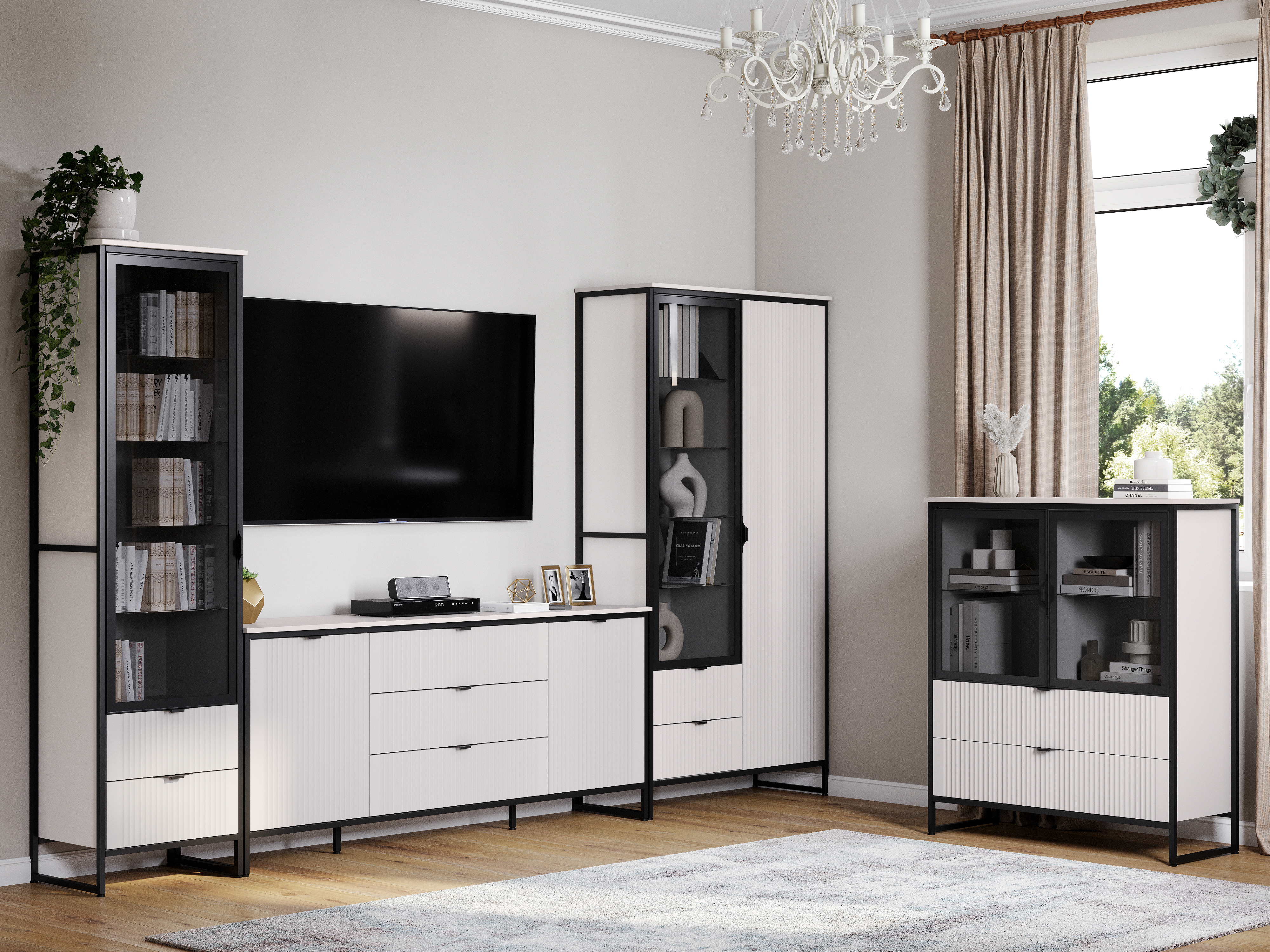 Коллекцию модульной гостиной "Нора" отличает современный оригинальный стиль. Декоративная продольная фрезеровка на фасадах из МДФ и опоры на металлокаркасе цвета соответствуют модным тенденциям этого года в ведущих зарубежных коллекциях.